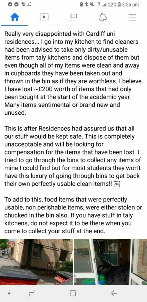 At Cardiff University, students have returned to their residences to find that their apartments have been ransacked and their personal property disposed of, damaged or shoved carelessly into bags. This is, reportedly, after having been assured by the university that residences would not be touched. The University apparently also gave the students the offer to collect all their belongings at the end of term, which they seemingly reneged upon without notifying the students.