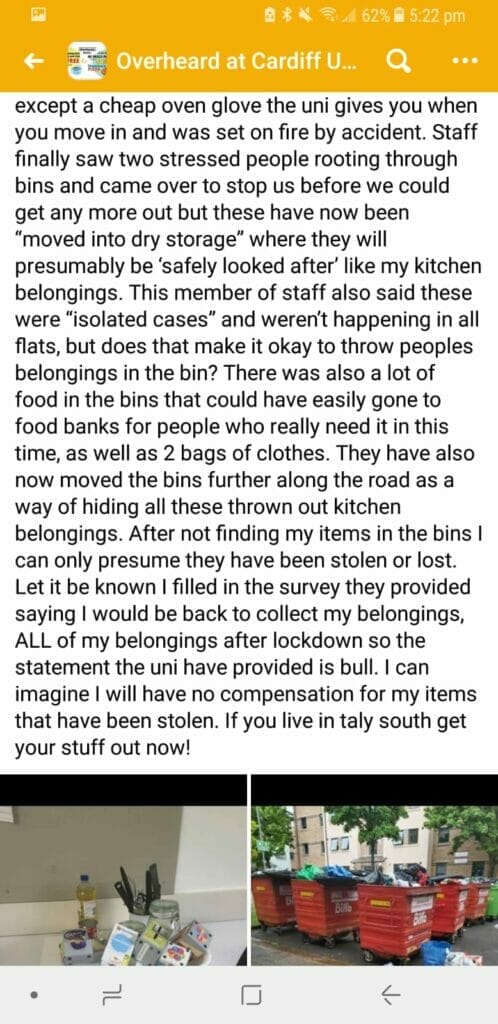 Pictures have emerged of skips filled with peopleโ€™s belongings, including clothes as well as a jumble of kitchenware left strewn over the pavement. One student recorded in a Facebook post how the staff had poured water all over their pictures and had destroyed their room decorations.